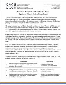 Le conseil d’administration du Conseil canadien de certification en architecture (CCCA) a récemment signé un engagement en faveur d’une action climatique équitable. Ce faisant, il a officialisé la responsabilité de l’organisation à l’égard de l’atténuation du changement climatique et de l’adaptation à ses effets par une planification et une action climatiques opportunes et éthiques. Par son engagement, le CCCA jette les bases de cette priorité organisationnelle dont les objectifs premiers sont la carboneutralité et l’équité.